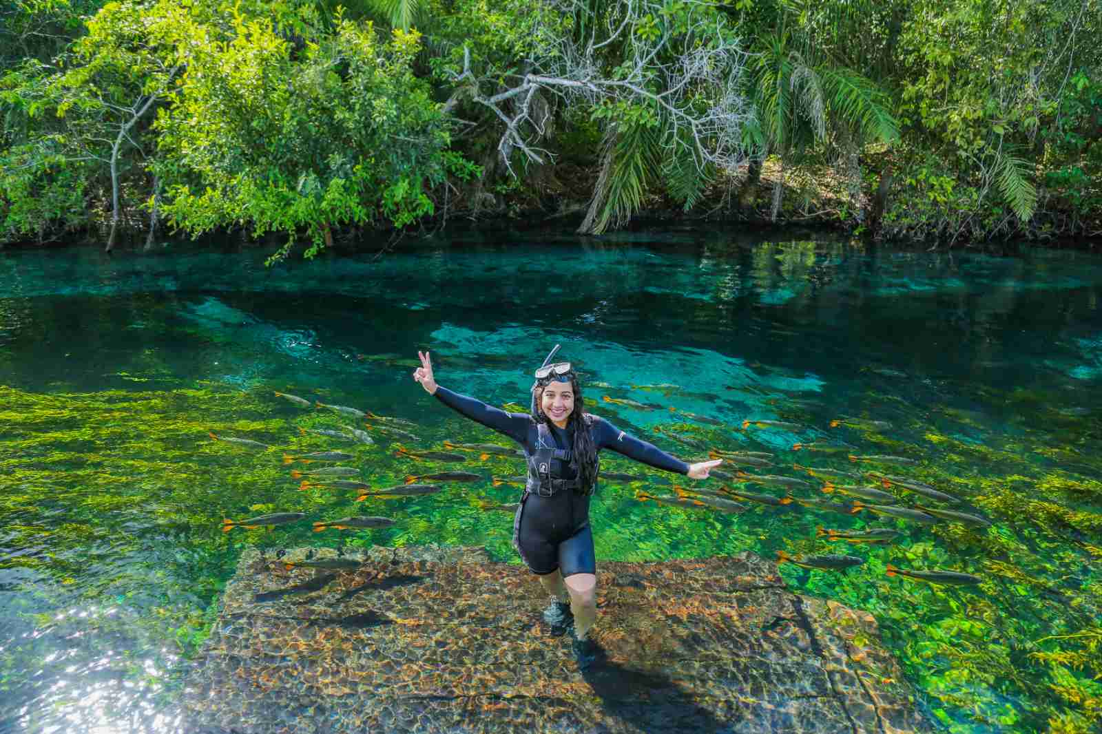 Hoje, nossa aventura começa com uma visita ao Rio Sucuri, famoso por suas águas cristalinas e cercado por uma natureza exuberante. Após receber seu equipamento, faremos uma caminhada de aproximadamente 15 minutos, apreciando a rica fauna e flora local. Em seguida, será hora da flutuação: percorreremos cerca de 1.800 metros mergulhando nas águas límpidas, rodeados por peixes coloridos e uma flora subaquática impressionante.